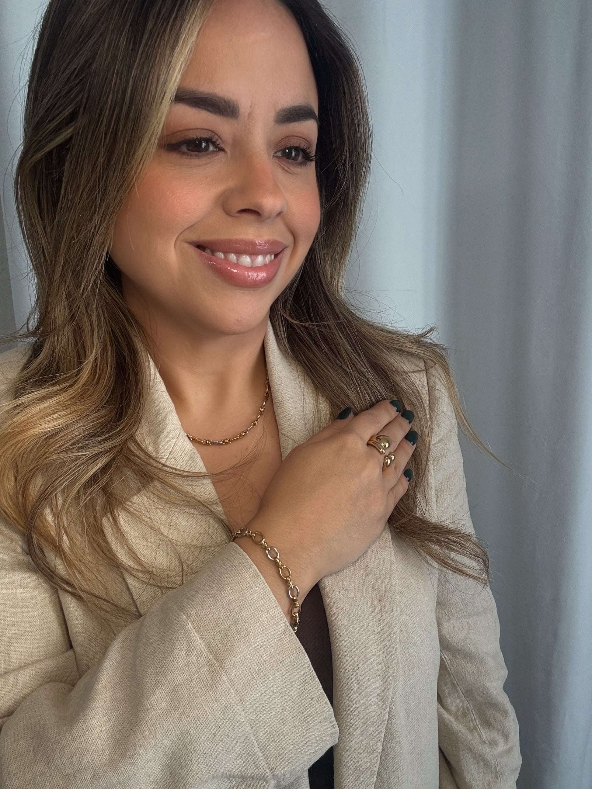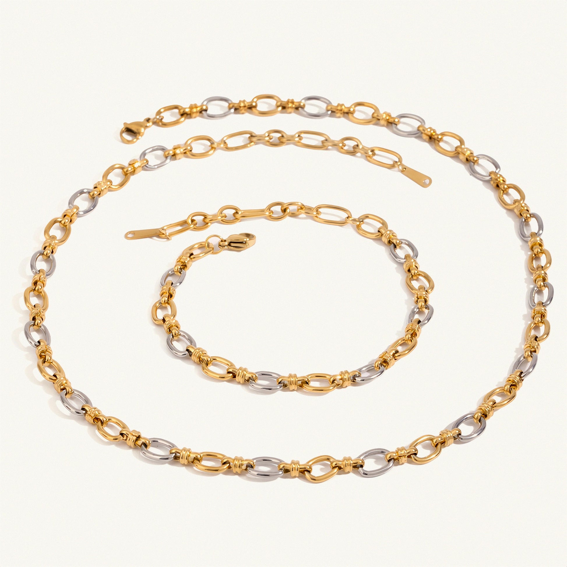 A timeless two-tone chain featuring alternating gold and silver oval links with intricate wrap details — elegant, versatile, and perfect for layering or wearing solo.