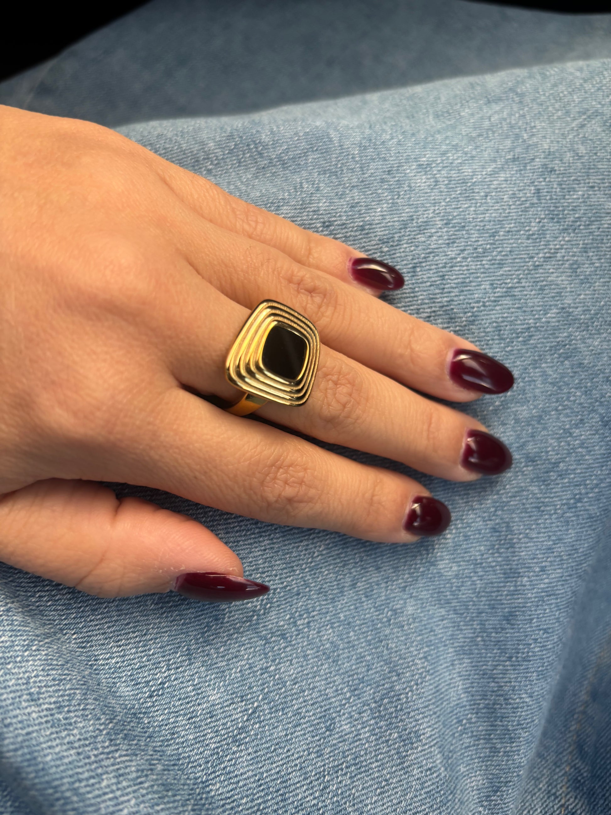 A bold gold-tone ring featuring layered square frames surrounding a sleek black center for a striking, sculptural touch.