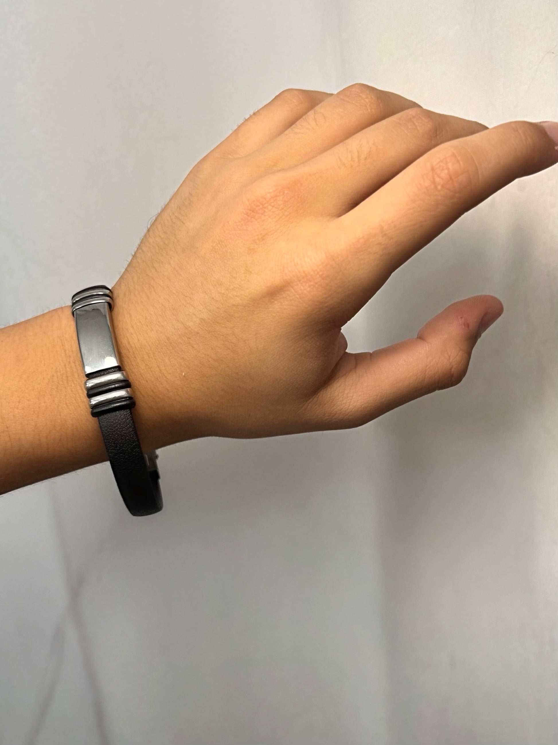 A modern men’s bracelet featuring a sleek black band accented with brushed stainless-steel ridge details. Minimal, masculine, and effortlessly stylish—perfect for everyday wear or a polished casual look.